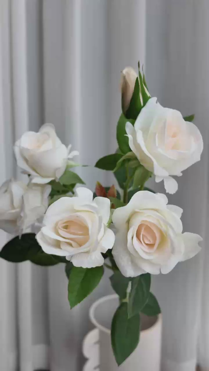 This stunning real-touch artificial multi-headed rose features five fully bloomed flowers and one delicate bud, offering a beautiful, natural look. The petals are crafted with a wet-feel material that mimics the softness and texture of real roses. Standing at 70 cm, the slender stem is adorned with rich green leaves, enhancing the overall lifelike appearance.